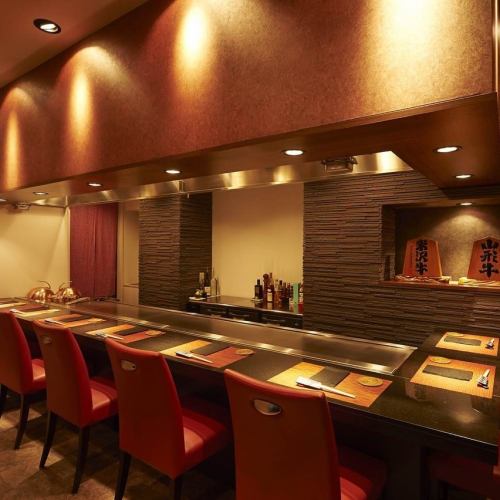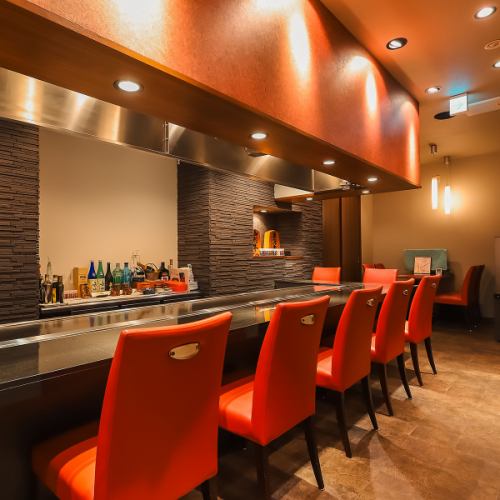 【五感で楽しむカウンター席】赤と黒を基調としたシンプルなデザイン。その洗練されたスタイリッシュさからも「鉄板焼き」の概念を覆す雰囲気を感じ取れます。カウンターに使用しているのは黒の大理石と、店主特注の4mにもなる鉄板。目の前で繰り広げられる調理の様子は圧巻!目で、香りで、舌でお料理をご堪能ください。